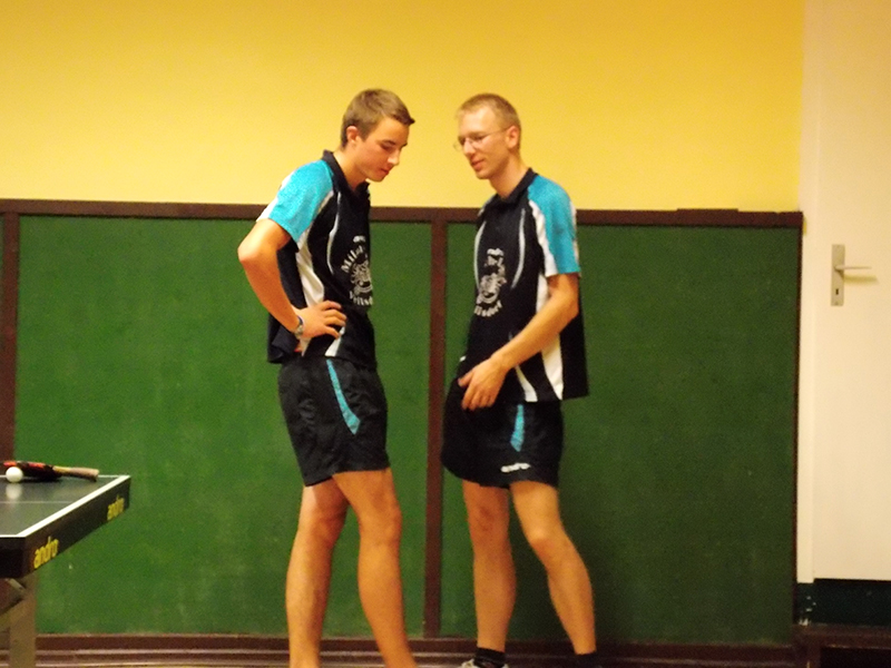Vor dem Spiel gibt Spitzenspieler Andy Schmidt dem Nachwuchsspieler Paul Plonné nochmal wertvolle Tipps, die zum Sieg führen sollten