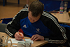 Der ehemalige Spieler Ronny Morgenroth begutachtet den Turnierplan mit kritischen Blicken
